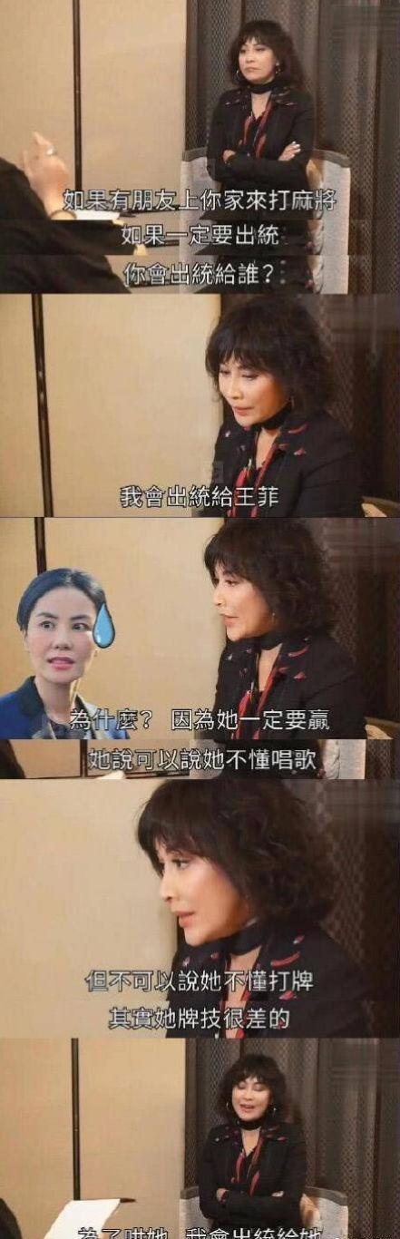 采访中,刘嘉玲被问及如果朋友来你家你会出统你会给谁?刘嘉玲一脸认真的说我会给王菲出统,被问及原因的时候,我们的女神回答是相当可爱了,王菲说她一定要赢,别人可以讲她唱歌不好听,但是一定不能说她打牌不好!