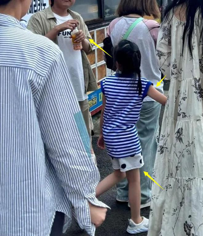 孙怡的女儿穿着蓝白条纹 T 恤,搭配白色波点短裤,虽然才 7 岁但已经手长脚长,身材酷似妈妈孙怡。不过小姑娘似乎被嘴馋路边摊的饮料,依依不舍的看着路人手中的饮料。但是孙怡显然拒绝了大福的要求,拉着女儿便径直往前走。
