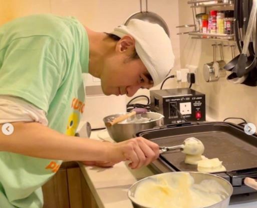 为了做蛋糕,古巨基还特意在头上系了一条白围巾。乍一看,他觉得自己像个厨师,于是把衣服拉了起来。看来他做蛋糕很有信心,也很正派。在镜头下,他弯下腰,拍蛋糕糊,非常严肃。