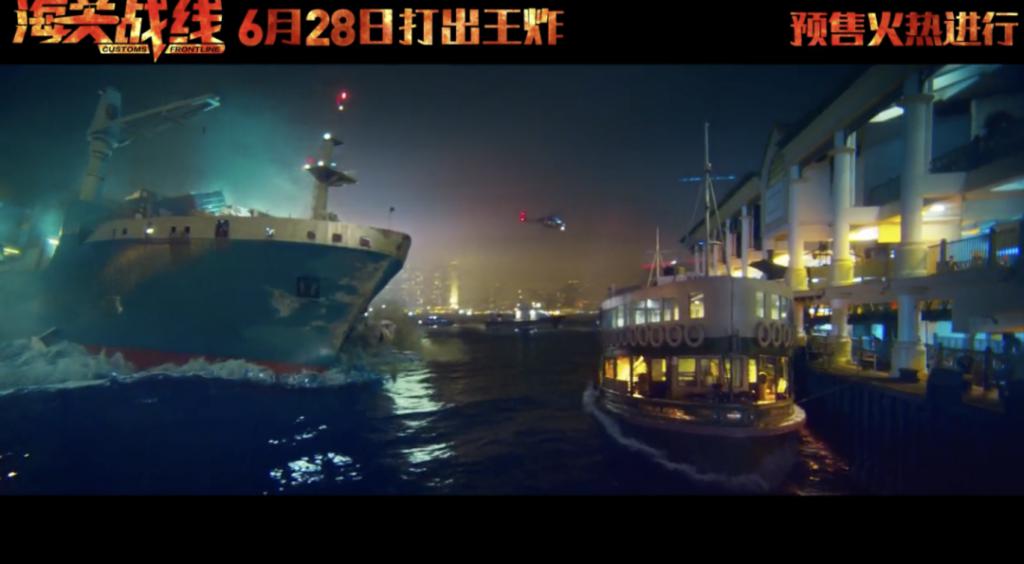 最终的画面就是这种阵型没有发生任何作用,一艘巨大的轮船,偏离了本身的航线,那些海关艇和海关人员被压倒翻覆沉入大海,在电影里一闪而过,最终巨轮一头撞向城市的本体。