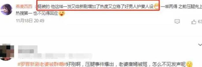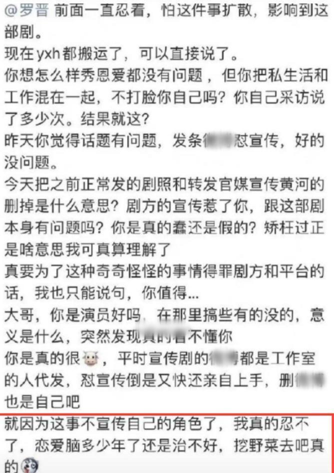 也有网友表示:罗晋之前绯闻上热搜也不见得出来回应,如今却站出来立人设,太装了。这分明就是在变相为新剧做宣传。也有网友表示:罗晋就是“恋爱脑“到无可救药的地步,不适合拍戏,应该去挖野菜去!