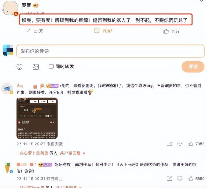 近日罗晋突然发文称,娱乐,要有度!触碰到我的底线!伤害到我的家人了!对不起,不跟你们玩儿了。随后更是将新剧《天下长河》所有动态全部删掉。