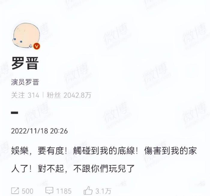 而随着该词条的爆火,罗晋再也坐不住了,于是发文怒斥剧方,称已经触碰到底线,伤害到我的家人,对不起,不跟你们玩了。本以为罗晋也就说说而已,毕竟为了这个剧,罗晋也付出了很多,不可能随随便便就不玩了。