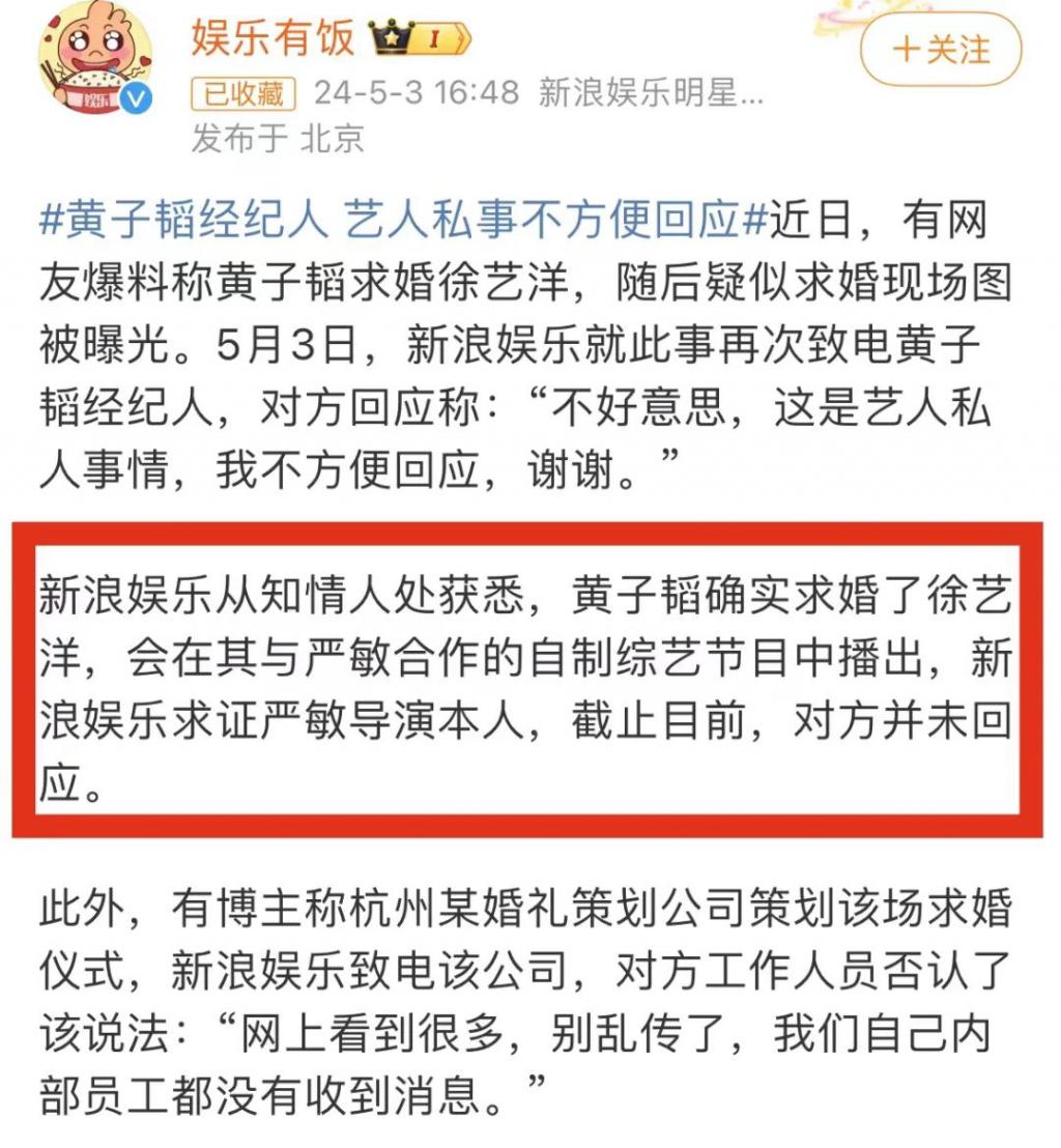 而知情人士则表示 " 求婚片段会在综艺里播出 ",又有人爆出了策划求婚的公司但是策划公司却表示自己不知道有这回事。