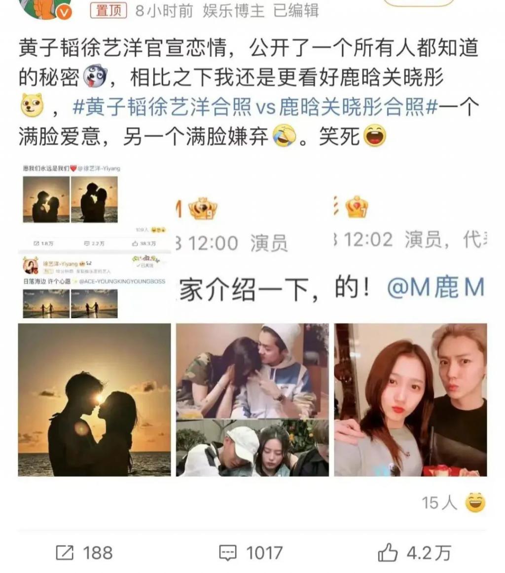再然后就是几个比较标志性的事件,去年 10 月,黄子韬直接在韩国夜店表白徐艺洋,再到疑似求婚,和最近刚刚发生的疑似领证。