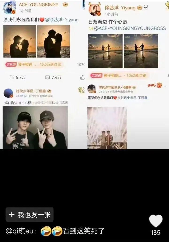 黄子韬这边的 " 愿我们永远是我们 " 撞了马嘉祺在去年 2 月发的微博,而徐艺洋的 " 日落海边 许个心愿 " 和丁程鑫 23 年 12 月的微博文案只差了两个字的位置。