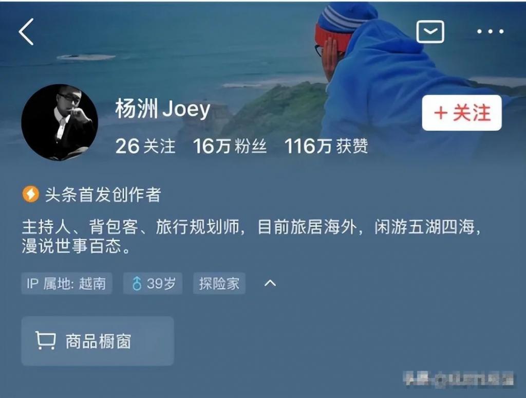 估计杨洲自己也意识到事情闹大了。眼瞅着风言风语越来越多 , 他赶紧把自己平台上的认证从电视台主持人改成了 " 主持人、背包客、旅行规划师 , 目前旅居海外 "。就连 IP 属地也变成了越南。看样子是想撇清关系。