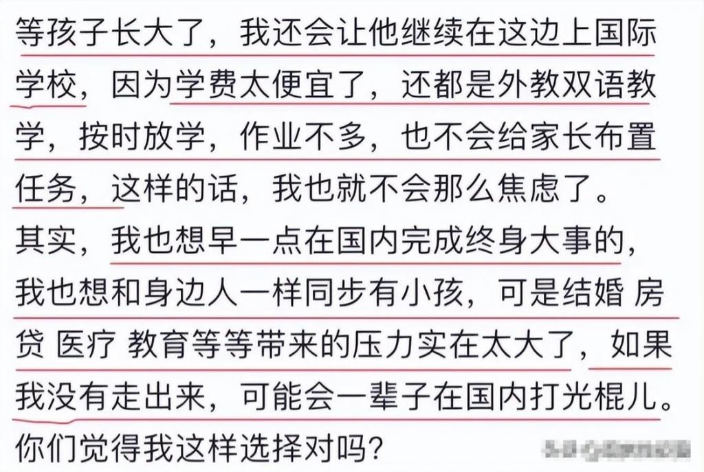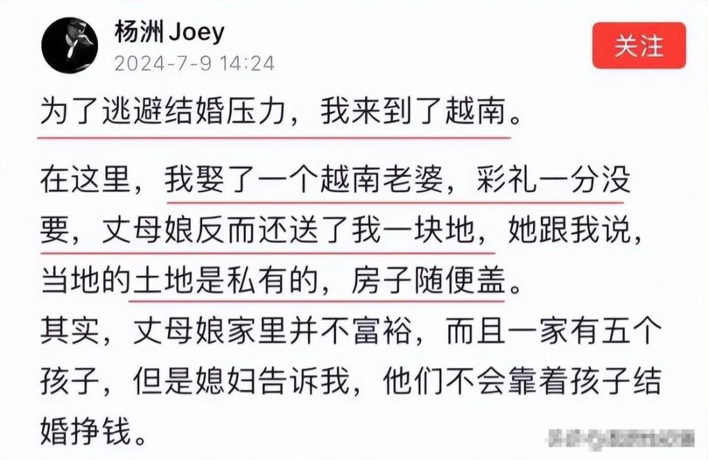 " 在越南 , 我娶了个当地老婆 , 一分彩礼都没要 , 丈母娘还送了我一块地 , 说以后想盖啥房就盖啥房。" 杨洲还表示等儿子长大了就让他在当地上国际学校 , 又便宜教学质量又高。