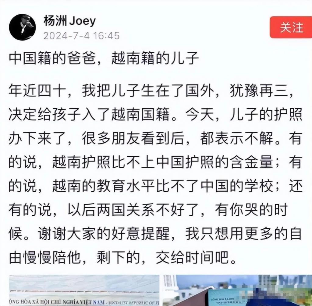 一位名叫 " 杨洲 Joey" 的博主最近火了 , 这位博主把自己儿子生在越南 , 还给娃入了越南国籍。结果这事儿一曝光立马在网上炸开了锅。