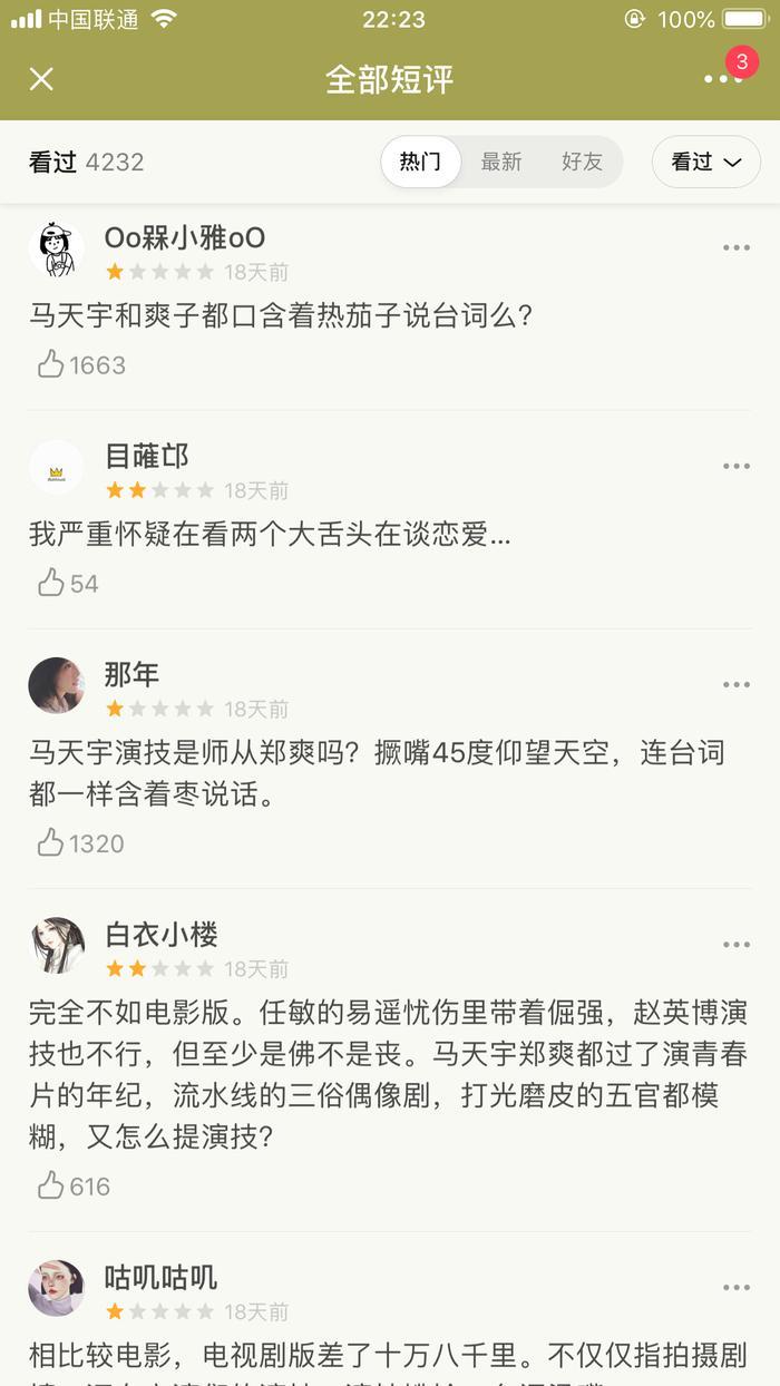 郑爽,马天宇 在湖南台播出的剧《流淌的美好时光》评分3.0分,这是湖南台近几年最低的一个剧了吧,而且这剧已经扑街,就首播当天买了很多热搜全部都在吐槽郑爽,马天宇演技和台词很烂