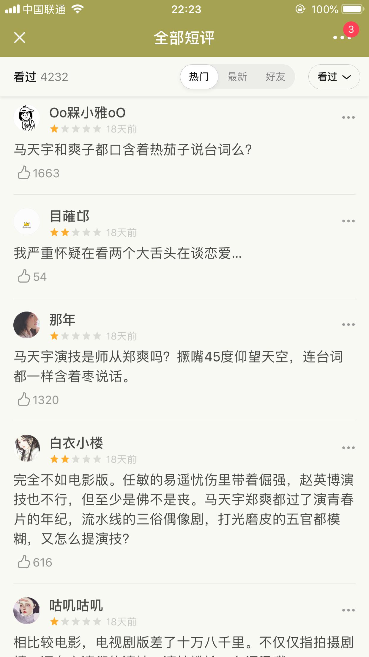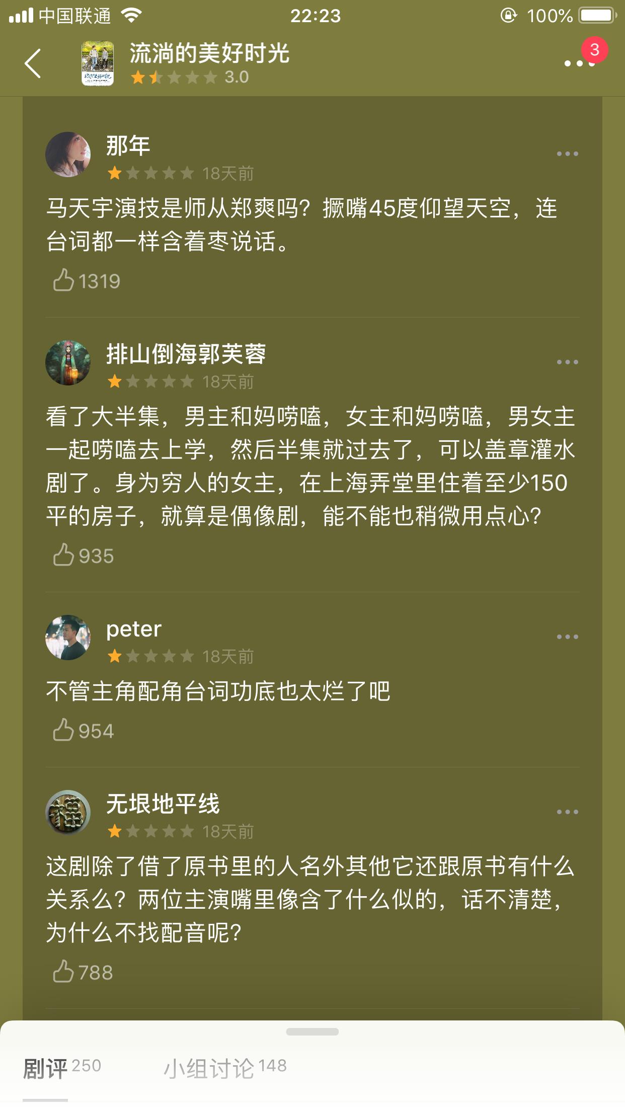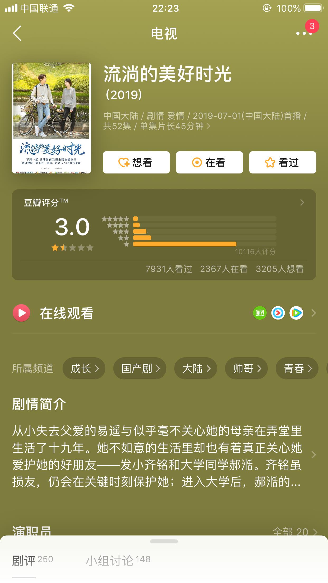 郑爽,马天宇 在湖南台播出的剧《流淌的美好时光》评分3.0分