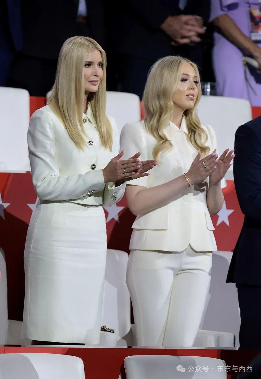两个女儿伊万卡和蒂芙尼都穿了白色套装 ↓↓ 双方的老公也都到场。