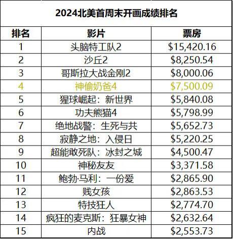 这一数字低于 2013 年的《神偷奶爸 2》(3501 万美元),后者同样在星期三亮相。紧接着《神偷奶爸 4》在 " 独立日 " 拿到 2040 万美元,前两天已迫近 5 千万线。自 5 号后《神偷奶爸 4》再扩大至 4428 家影院,首周末报收于 7501 万美元,单馆收益达到 1.69 万美元,取代《头脑特工队 2》夺魁。