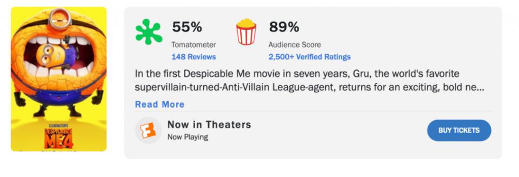 从口碑来看,《神偷奶爸 4》的烂番茄新鲜度只有 55%,影评人表示其 " 节奏明快,充满了闹剧式的笑料 ",虽然内容填塞显得过满,但也足够让观众享受看电影的快感;同时《神偷奶爸 4》的爆米花指数达到 89%,足见粉丝对这部新作仍相当满意。作为对比,《神偷奶爸 3》的两项指标分别为 58% 和 53%,该系列在媒体风评上继续探底。