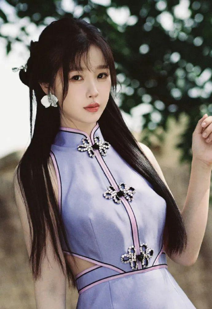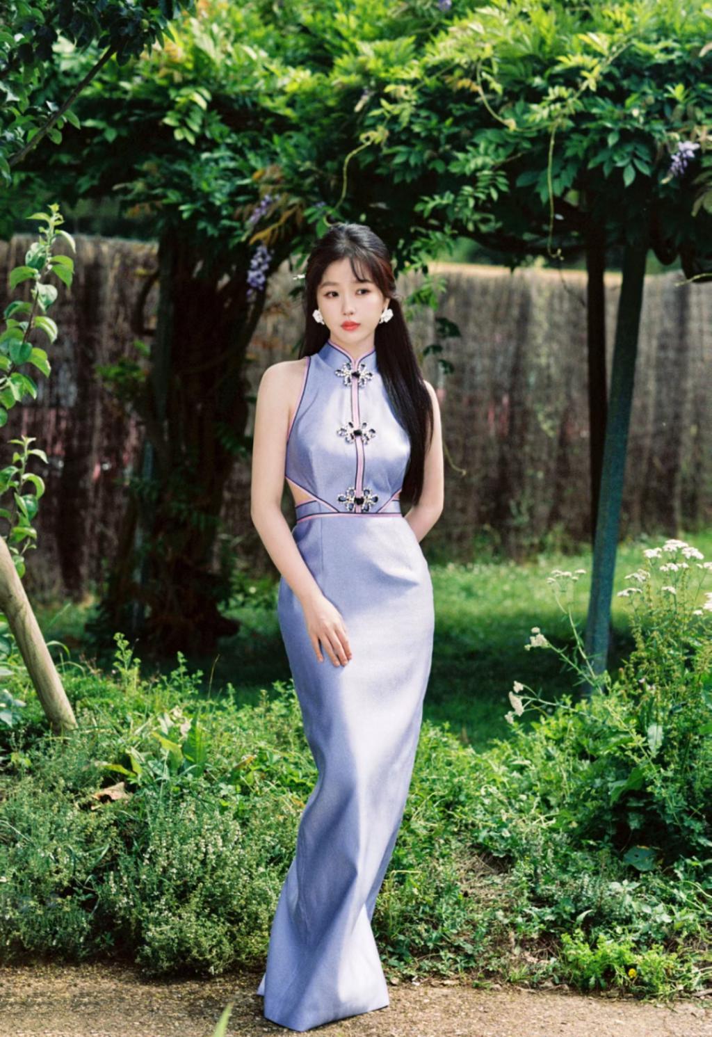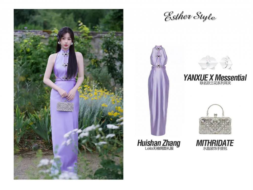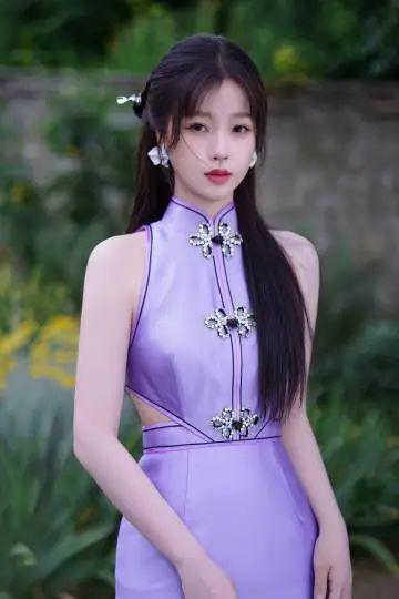 除了汉服外,还有好几套超级美的新中式 Look,紫色的露腰旗袍,让人眼前一亮,古典与现代的完美融合,温婉优雅又略带性感。