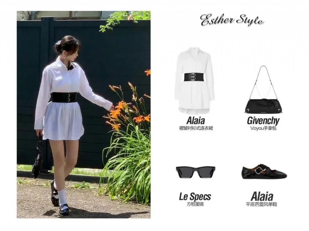 简约的 Alaia 白衬衫搭配黑色腰封,流畅的裁剪勾勒身材,搭配 Alaia 的交叉绑带芭蕾舞鞋,