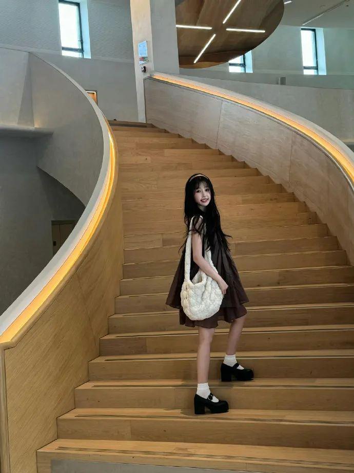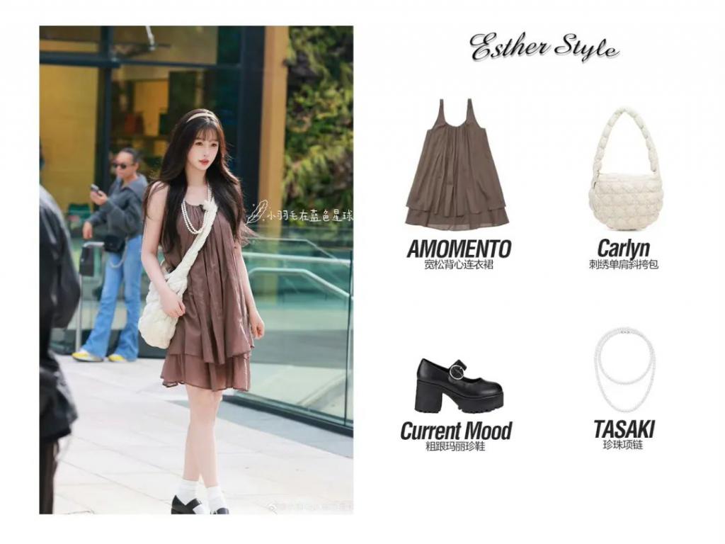 棕色连衣裙搭配玛丽珍鞋,珍珠项链发箍点缀,温柔气质又不失可爱。