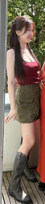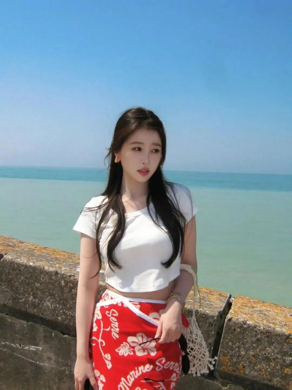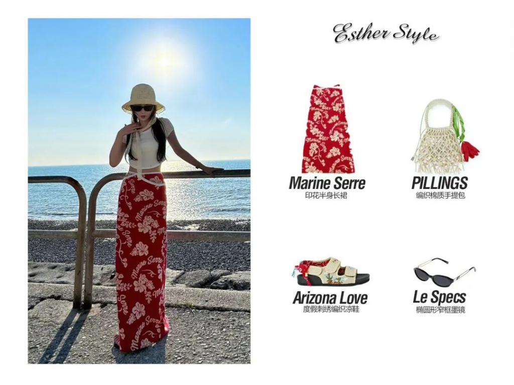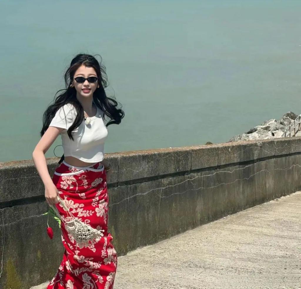 白色露腰上衣搭配亮眼的红色花朵半裙,法式度假风稳稳拿捏!