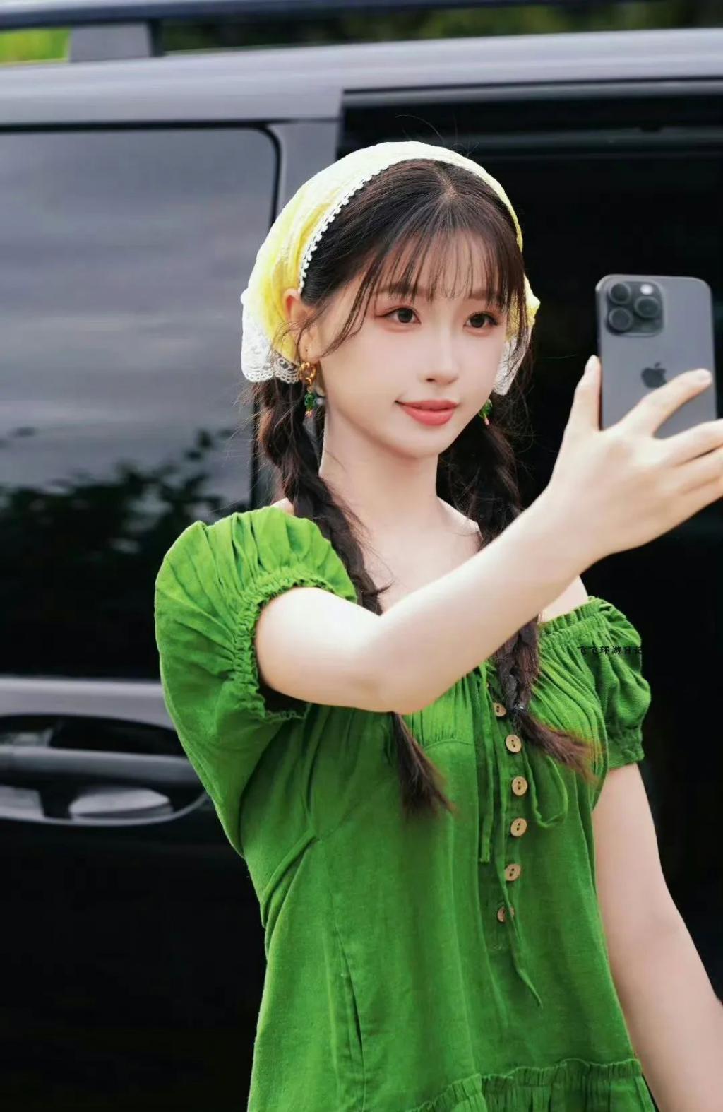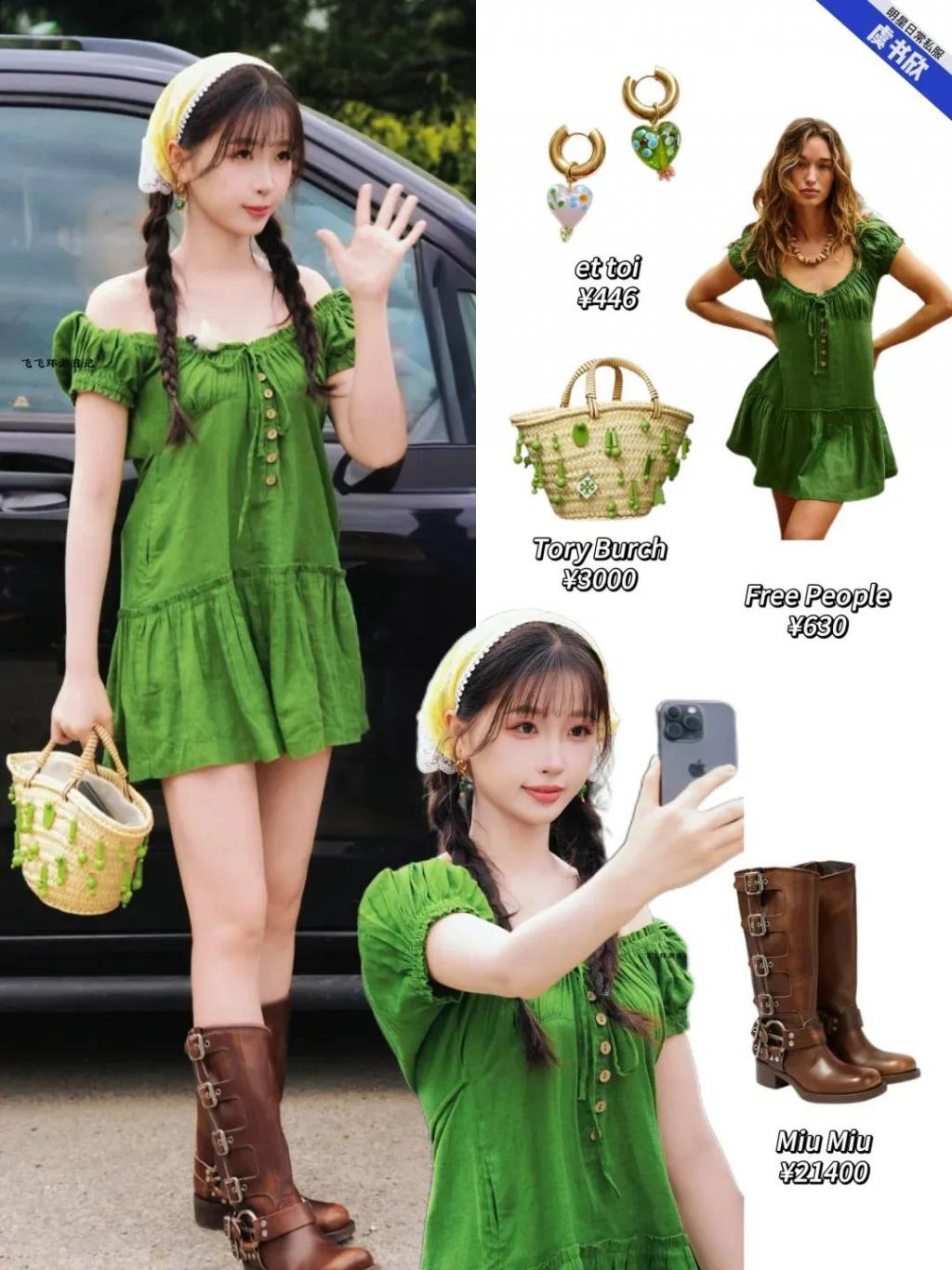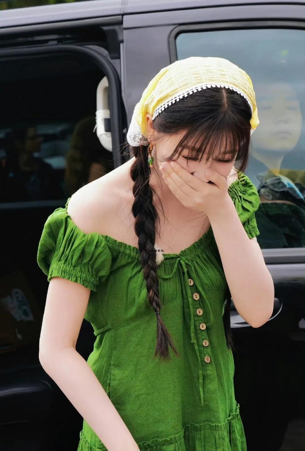 绿色连衣裙清新明媚,加上头上戴的头巾,一整个青春动人的法式田园风。