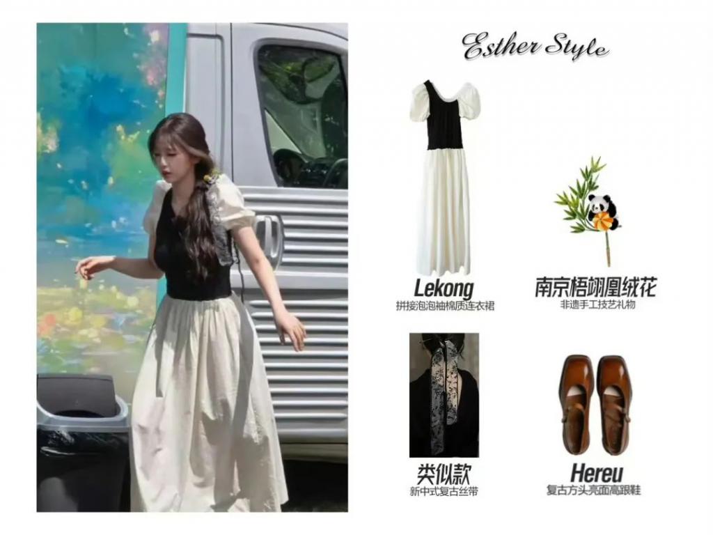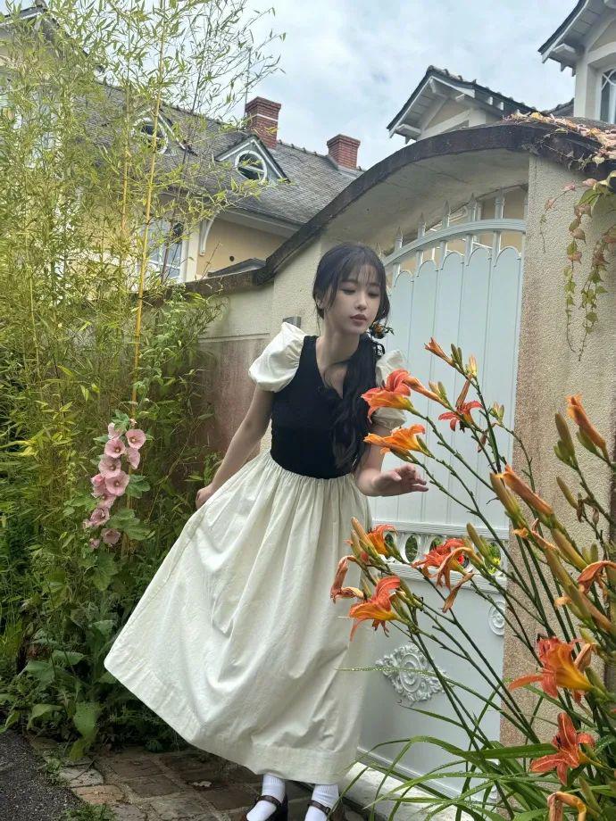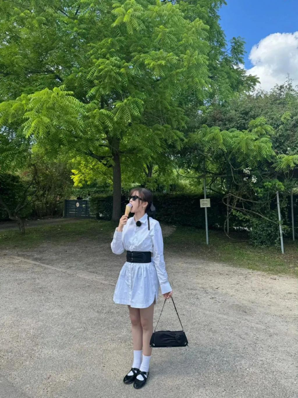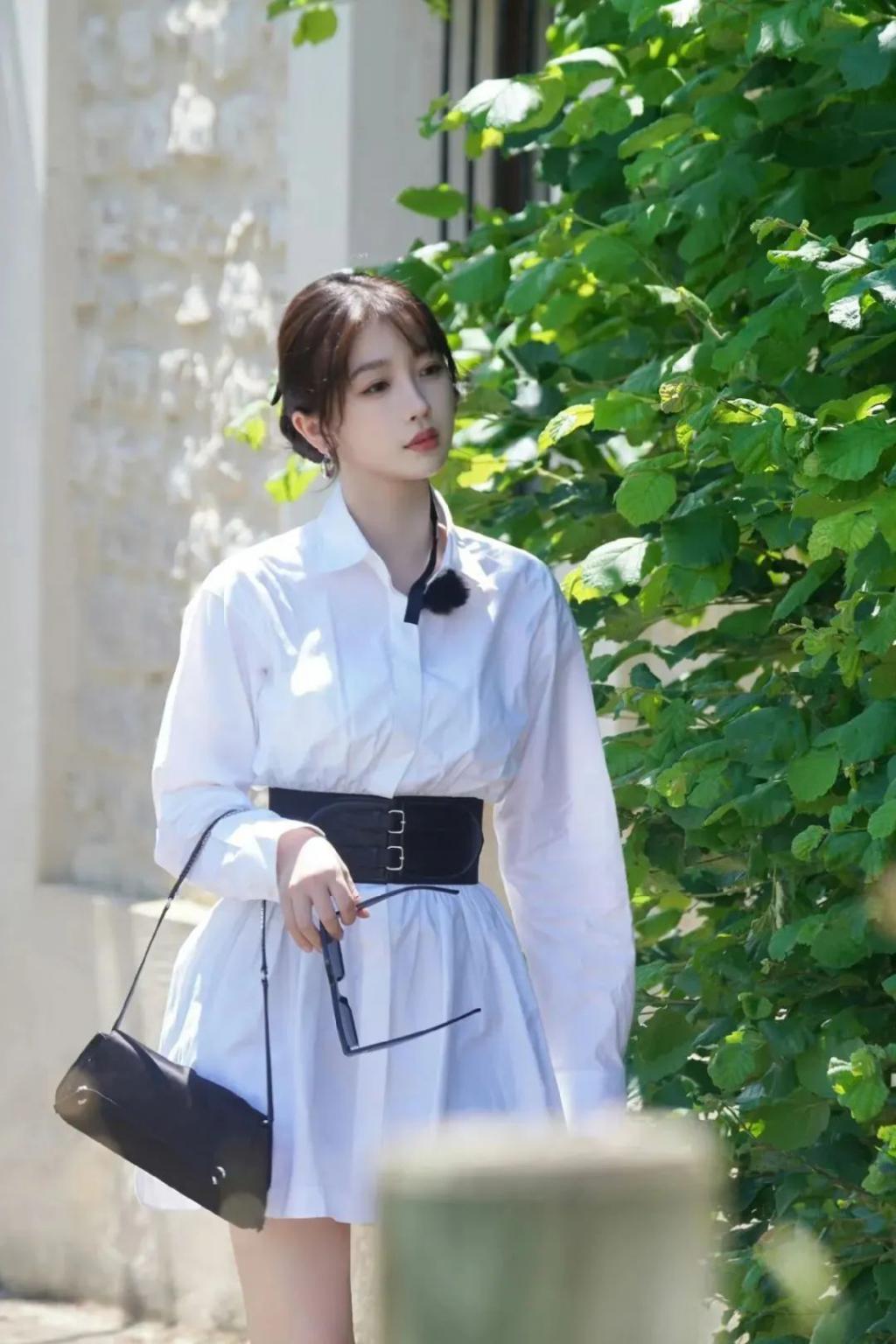 这次的拍摄地在风景优美的法国小镇,虞书欣的 OOTD 很应景地拿捏了法式复古风情,黑白配色的泡泡袖连衣裙,可爱又俏皮。