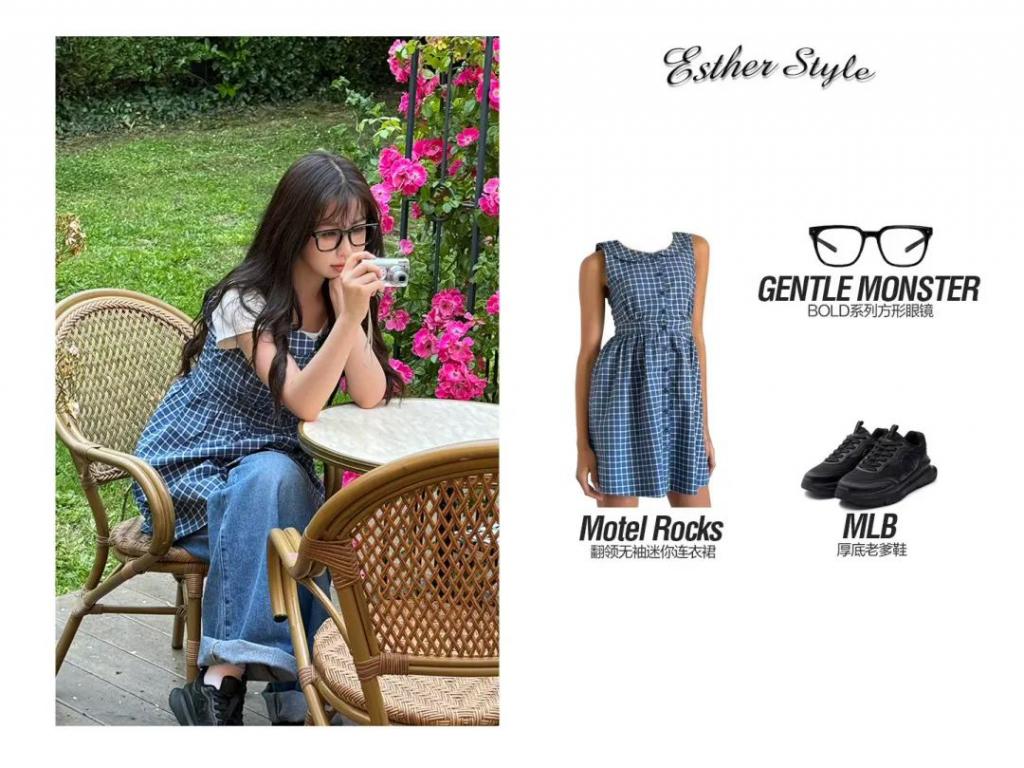 充满法式风情的蓝色格子连衣裙,翻领无袖的设计非常复古,欣欣子叠穿了裤子,松弛感拉满。