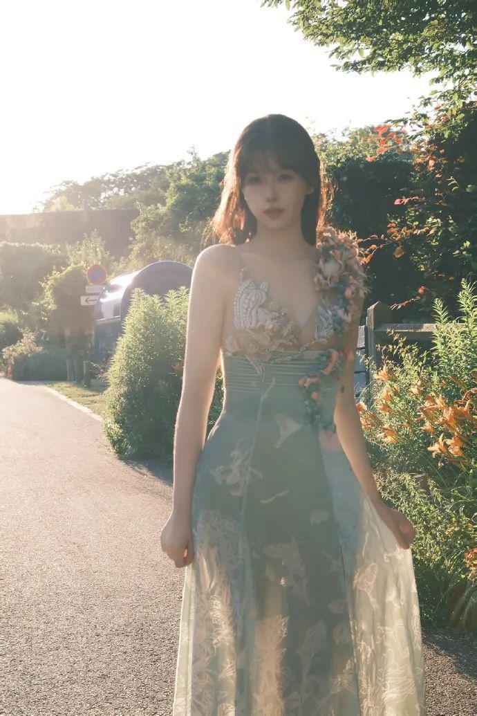 吊带连衣裙 + 黑色针织外搭,融入中式氛围的南法浪漫风情。