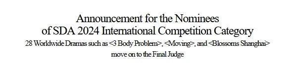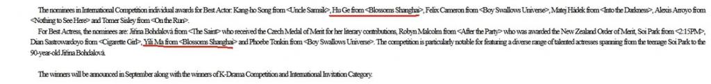 7 月 30 日,据首尔国际电视节官网消息,胡歌、马伊琍凭借《繁花》入围 " 首尔电视剧大赏 2024" 最佳男女主角,其他提名演员还有宋康昊、朴昭怡等。