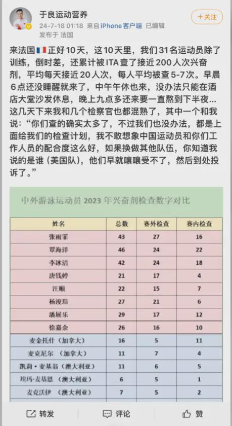 更不用说,这次奥运会才开始,我国游泳队刚到法国十天,就已经接受了近 200 次兴奋剂检测,而有些国家的选手却一次都没有。