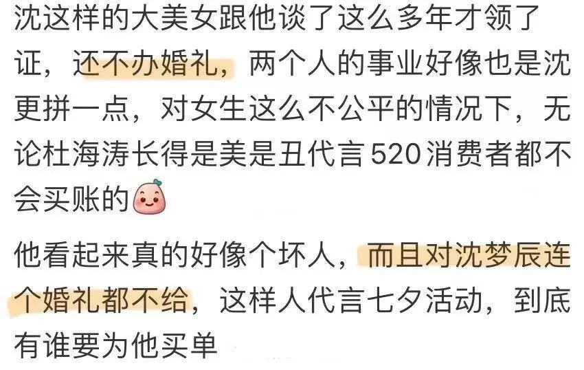 才不到三个月路人缘就跌到谷底,除了长久以来的不办婚礼争议,更多的或许还有杜海涛对沈梦辰的态度问题。