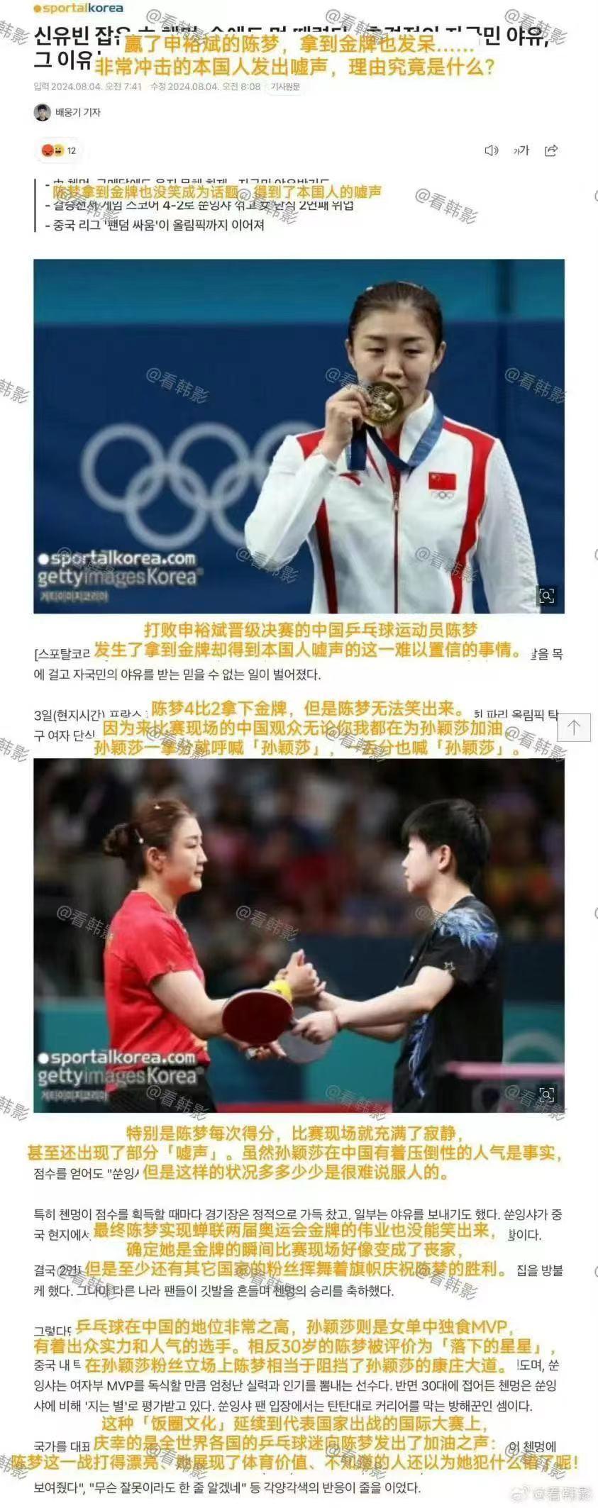 甚至在韩网热帖也能看到类似的声音:" 赢了申裕斌的陈梦,拿到金牌也发呆,冲着本国人发出嘘声,理由到底是什么?"