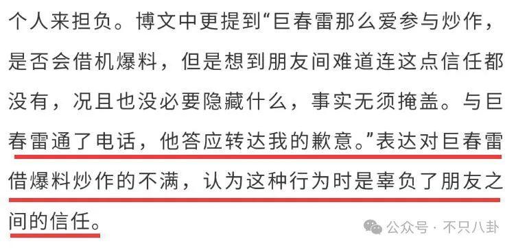 经纪人还怒斥巨春雷不厚道,本打算通过他向李依晓致歉,没想到他却把这事儿曝光了出来。
