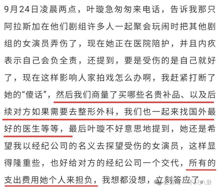 一周后,业内人士巨春雷曝光李依晓的伤口是被叶璇的狗所咬伤,头部和耳朵伤口缝线多达二十余针,痛斥叶璇作为狗主人的失职。