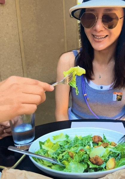 男友亲手喂李依晓吃东西,很会照顾人的样子。