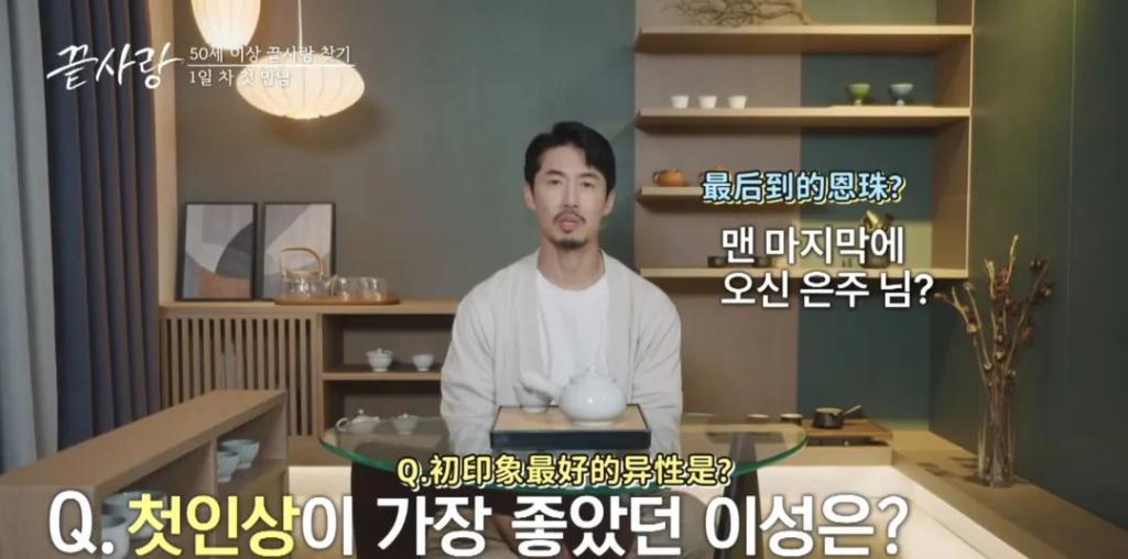 51 岁气质大叔对 50 岁温柔阿姨一见钟情!金万基在第一次见到恩珠的时候就被狠狠吸引,而且在备采的时候也明确表示出来对最后来的恩珠非常有好感。