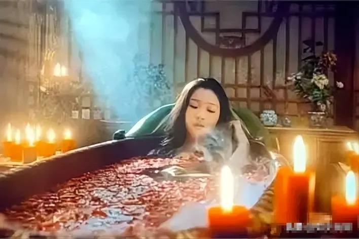 烟雾缭绕的房间内,摆放着漂浮着各种鲜花的澡盆,周围是一个又一个红烛。