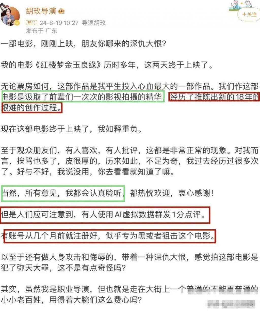 看到网友如此不买账,导演胡玫大胆开麦,称这些恶评都是 AI 群发,针对部分言论甚至出动律师存证。