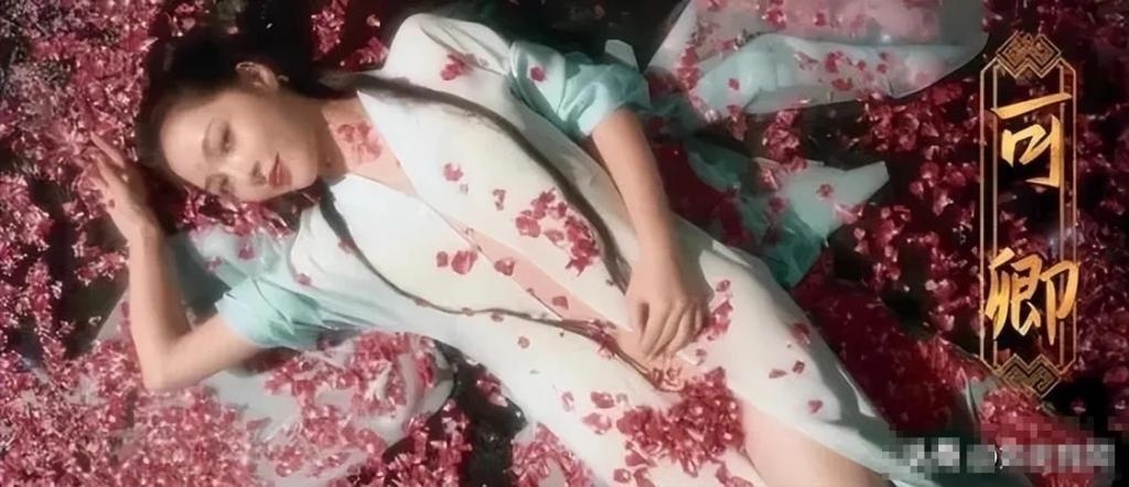 她躺在地上,周围布满花瓣,身穿浅色薄纱,面露风情,薄纱堪堪遮住隐私部位。