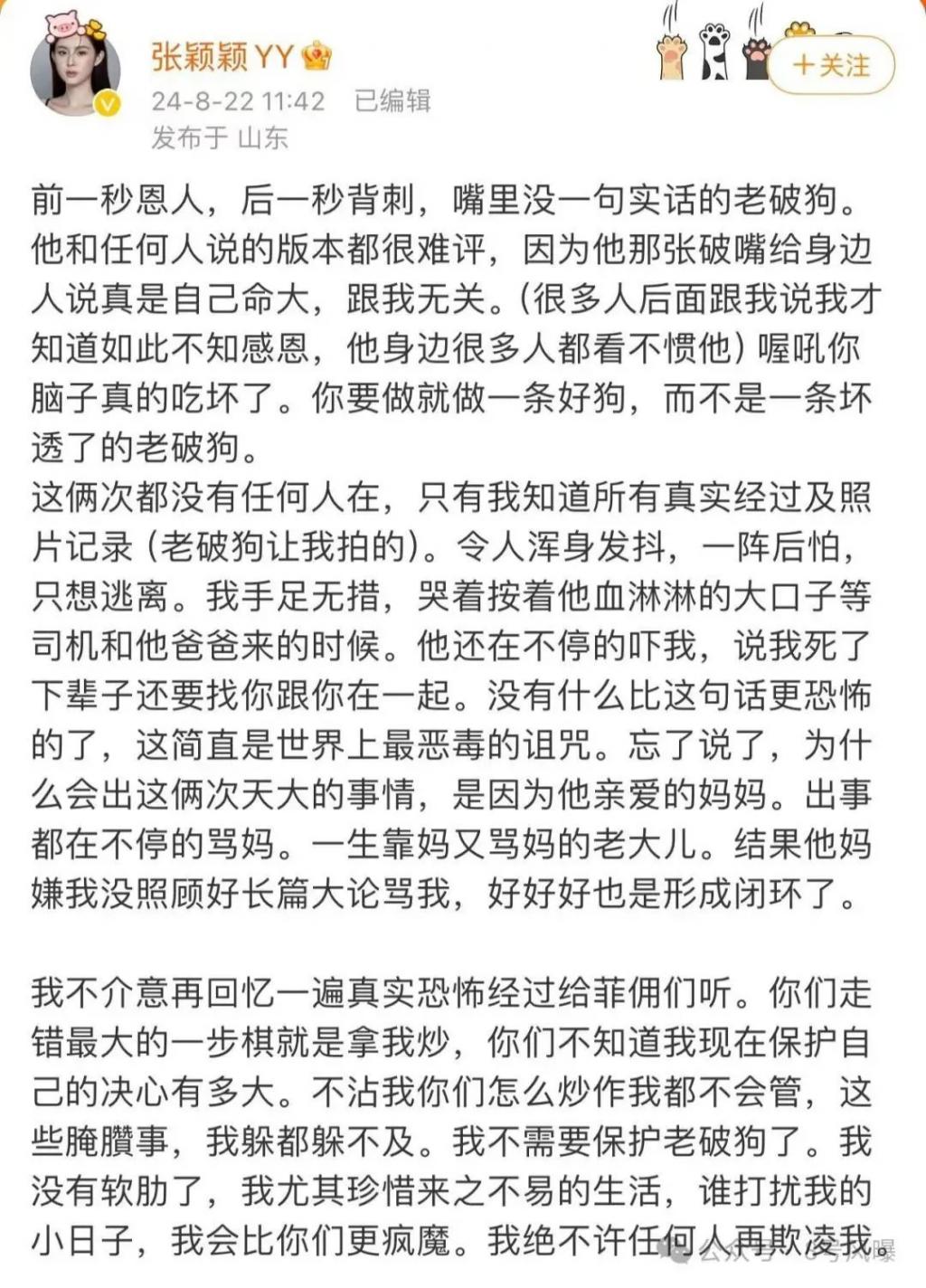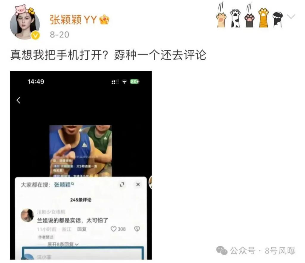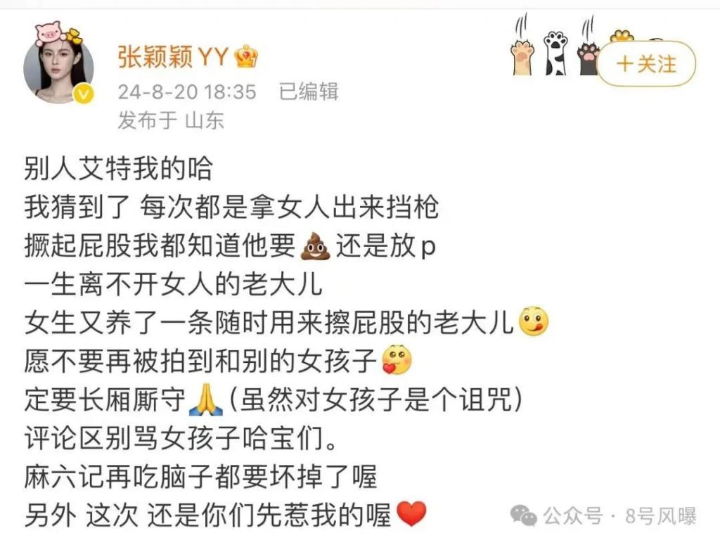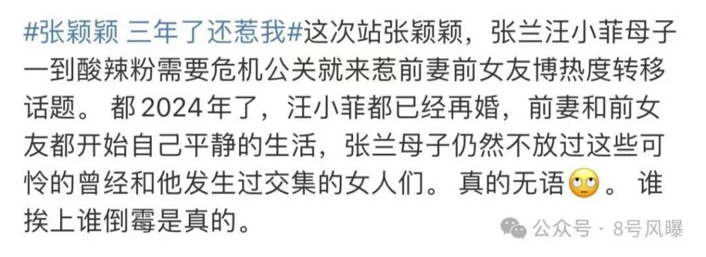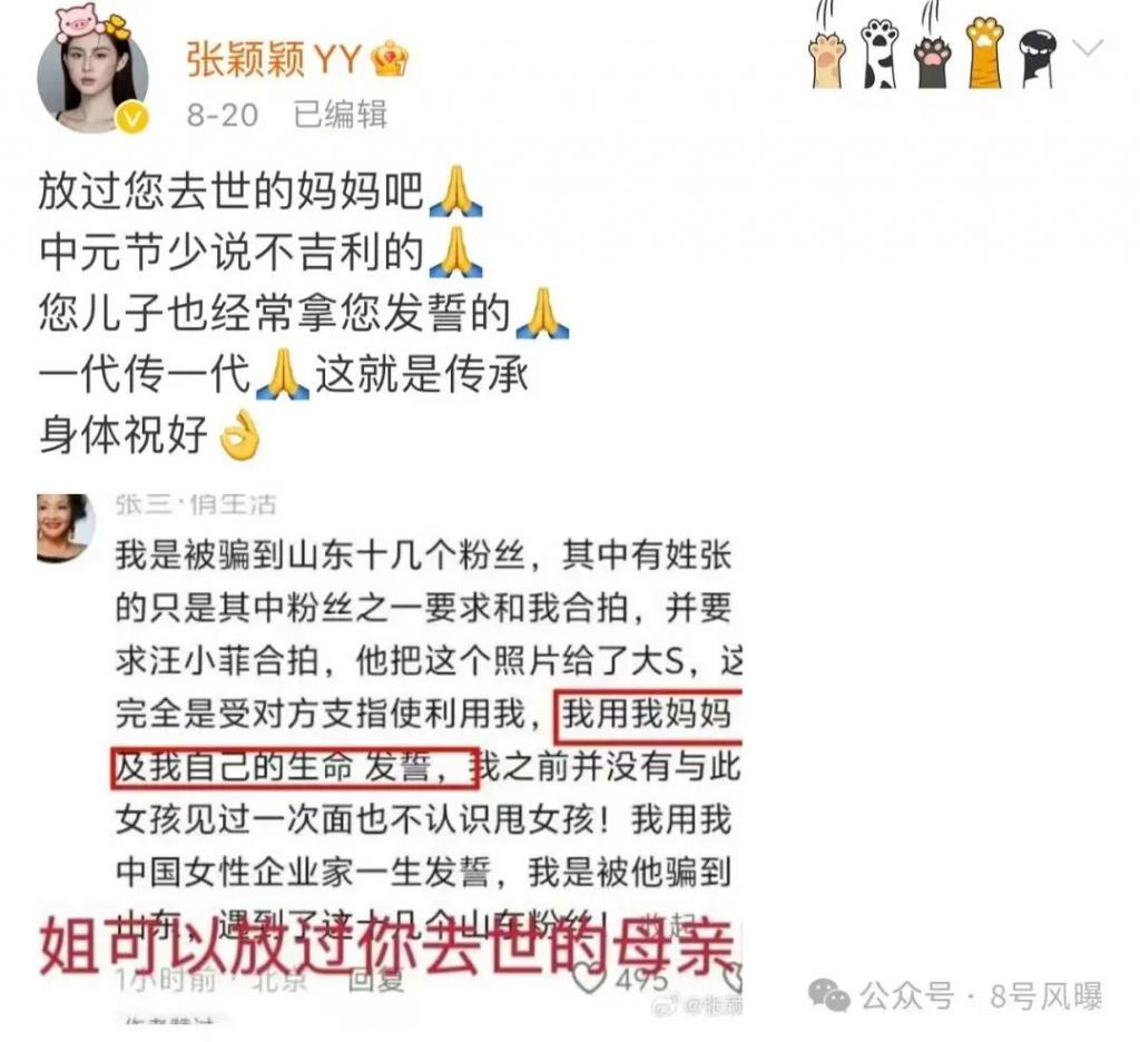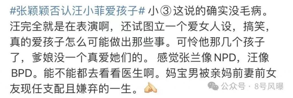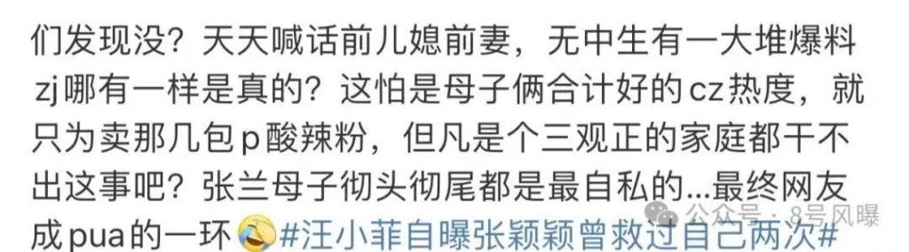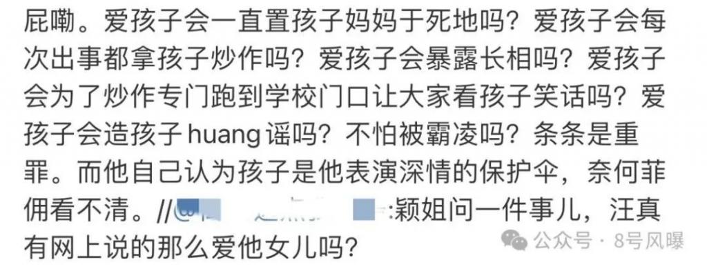 8 月 22 日,张颖颖再曝猛料,称汪小菲是极其会演戏、会伪装的人,最爱的是装深情,爱孩子就不会把孩子妈妈置于死地,也不会暴露孩子的长相。