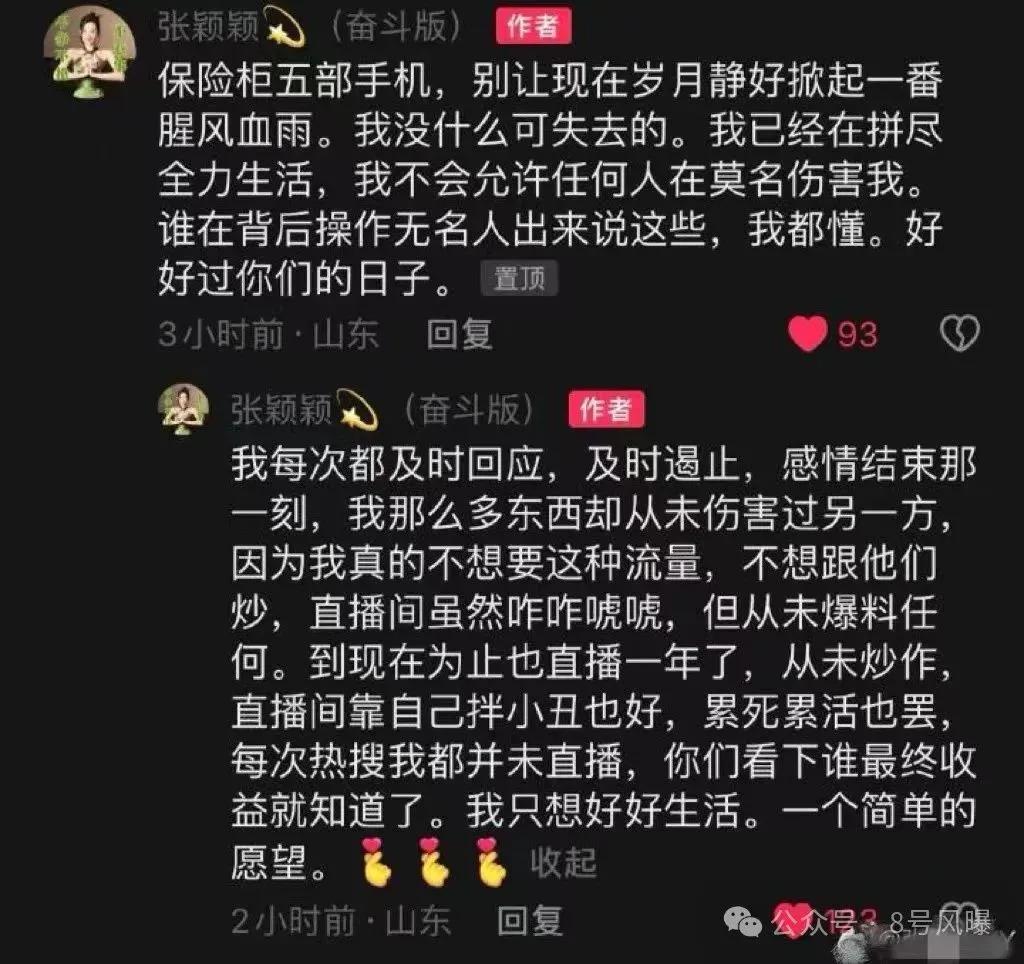 张颖颖说自己想好好生活,也不想要伤害对方,别让岁月静好掀起一波腥风血雨。她还表示自己有五部手机锁在保险柜里,暗示若再引战会全盘道出。