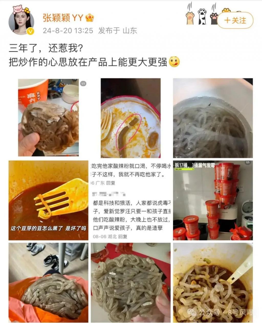 她先是晒出搜集到的麻六记酸辣粉出现食品安全问题的图片,配文质问 " 三年了还要惹我吗 ",并喊话 " 有炒作的心思不如用在做好食品上 "。