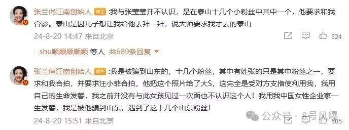8 月 20 日,张兰转发了葛斯齐直播的视频,并在评论区留言称不认识张颖颖,合照是因她是粉丝才拍的,还以性命和女企业家声誉发誓之前没见过张颖颖,是被她骗到山东的。