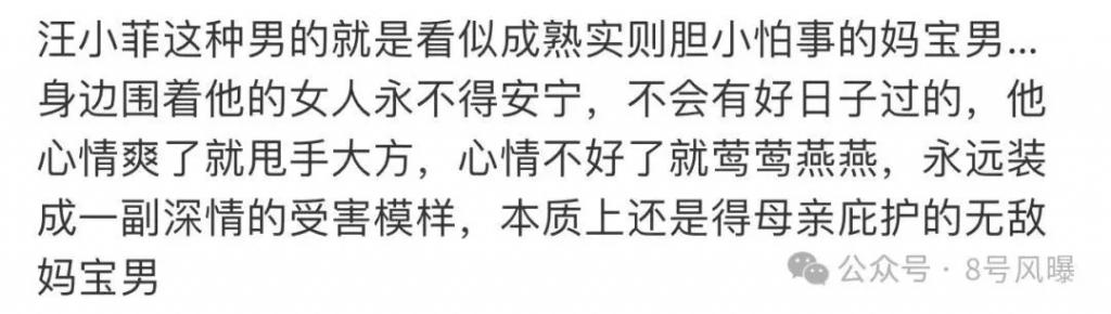 好像他这一生都在被母亲张兰支配,不少网友一致认为汪小菲不仅胆小怕事,还永远装深情,作为妈宝男会被所有相关女性都嫌弃,这些女性在他身边永远不得安宁。