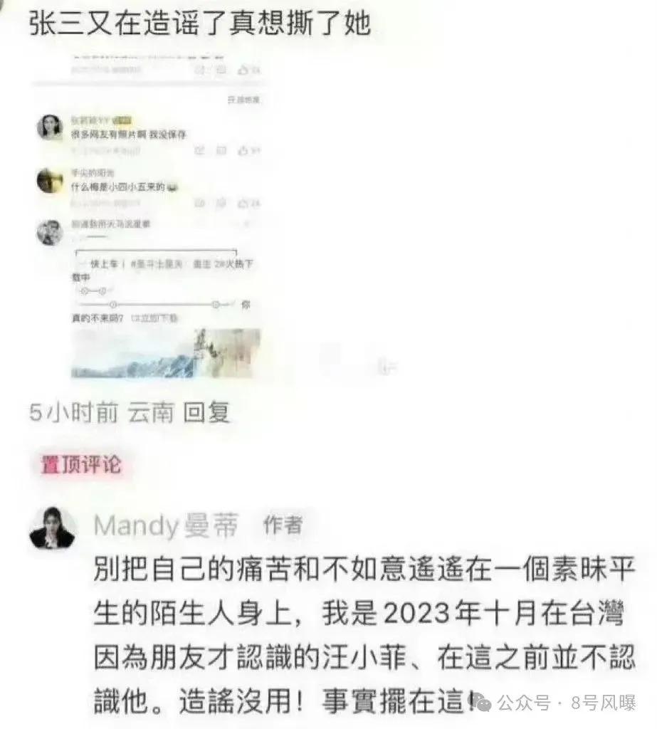作为汪小菲的妻子,马筱梅也加入战局,她在评论区回复网友,称自己是在 2023 年十月认识的汪小菲,在此之前并不认识他,还疑似喊话张颖颖不要造谣,并炮轰张颖颖 " 知三当三 "。