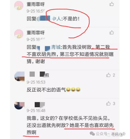同一时期,小胡班级的又一女生微博被扒出,她当时也发了一条特别隐晦的微博"其实你唱歌有点拐调,然后拐着拐着就不用再听了"也被指是内涵的胡先煦,而董雨霏在该微博评论道"宝贝,因为脏了"......