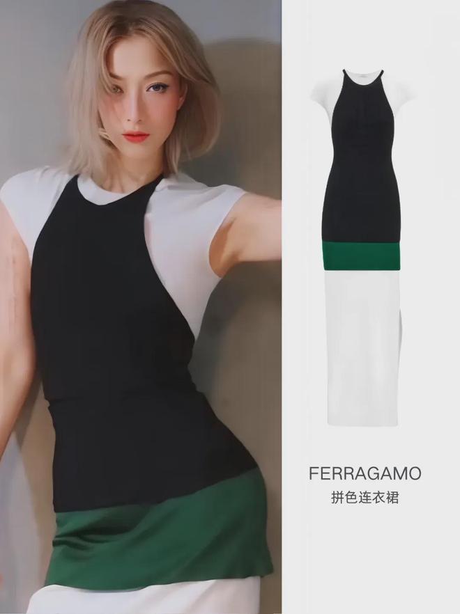 FERRAGAMO 的撞色连衣裙,被她穿出一种力量感,她自己也说,对这条裙子第一眼就有 feel,现在增肌后,更健康自信。▼
