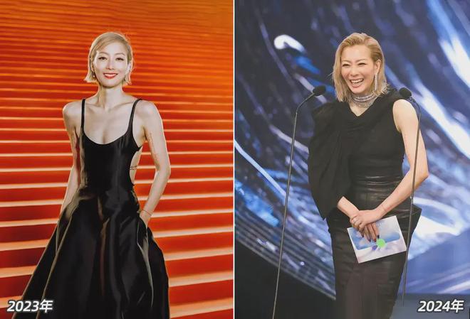 同样是西装造型,去年 3 月她出席香港电影评论学会大奖颁奖典礼时看起来面部凹陷,即使包裹严实也能感觉出她的 " 暴瘦 ",憔悴的模样让人看了很心疼。▼