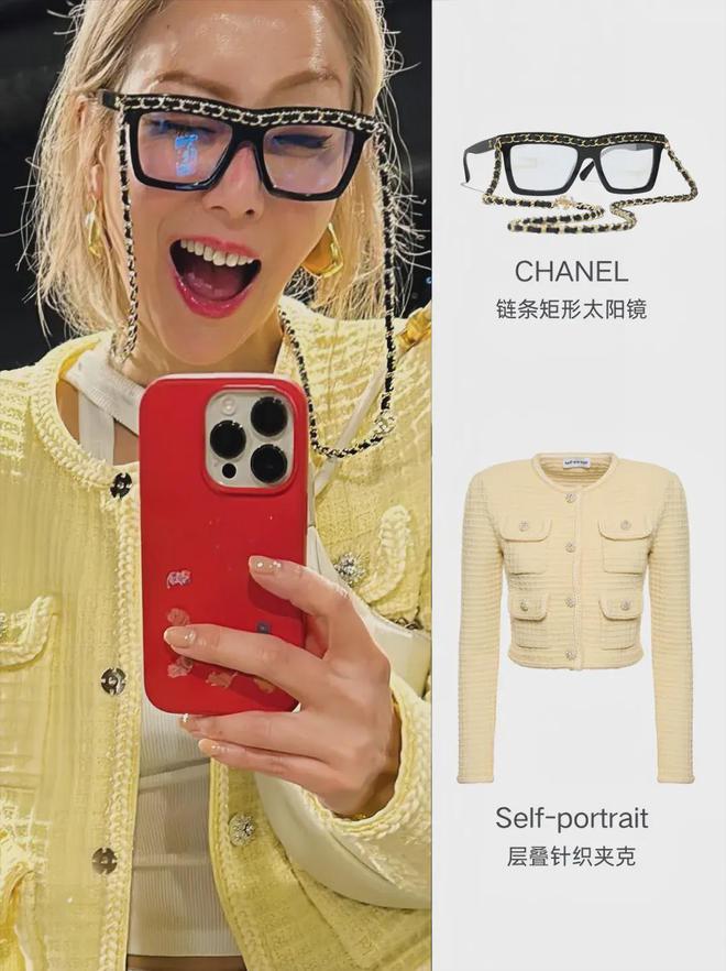 Self-portrait 的淡黄色针织夹克搭配 CHANEL 链条矩形太阳镜,既有知性美,搭配俏皮可爱的表情又显得青春有活力,说她年过半百谁敢信啊?▼