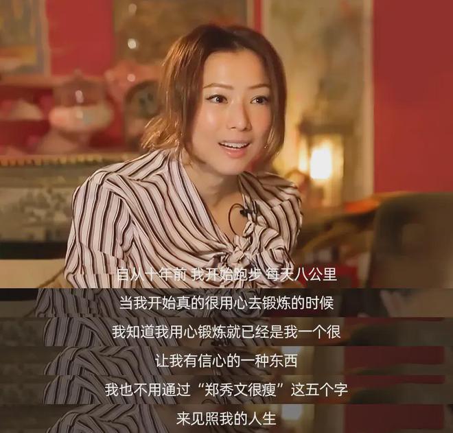 在 2017 年《鲁豫有约》节目中,她说自从十年前开始跑步,用心锻炼这件事已经逐渐给了她自信,而不用通过 " 郑秀文很瘦 " 这五个字来见照人生。▼