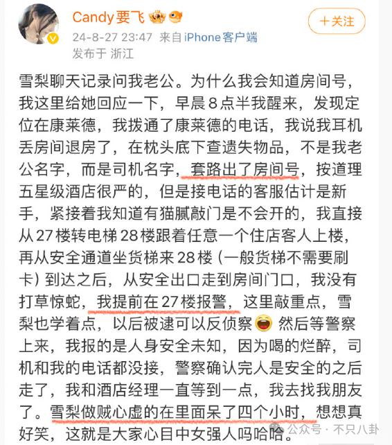 【Candy 要飞】似乎很有底气,继续在微博喊话,称警方正在调查中,雪梨已被限制出境," 如果不是吸毒,就是单纯发生男女关系,那性质也很恶劣 "↓