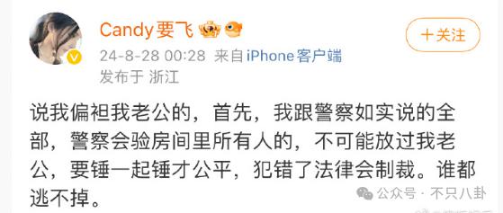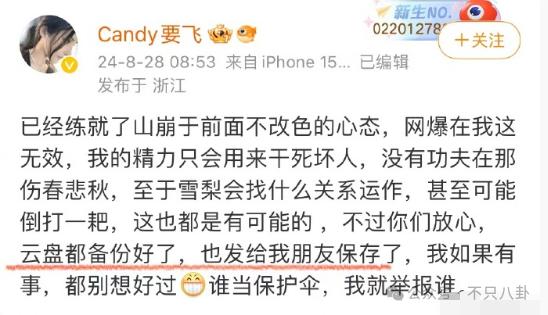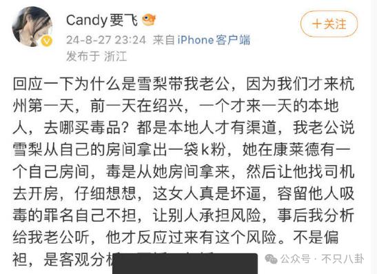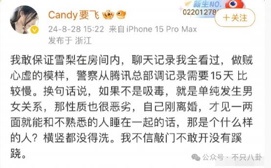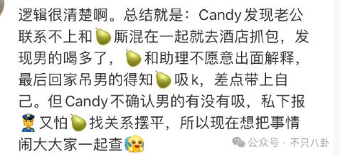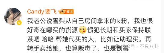 【Candy 要飞】也不含糊,又是一通输出,大致意思就是自己已经搜集证据,并且已整理好备份,雪梨发的声明 " 有个 p 用 ",还称如果老公也涉毒就一起处罚,让法律来制裁。